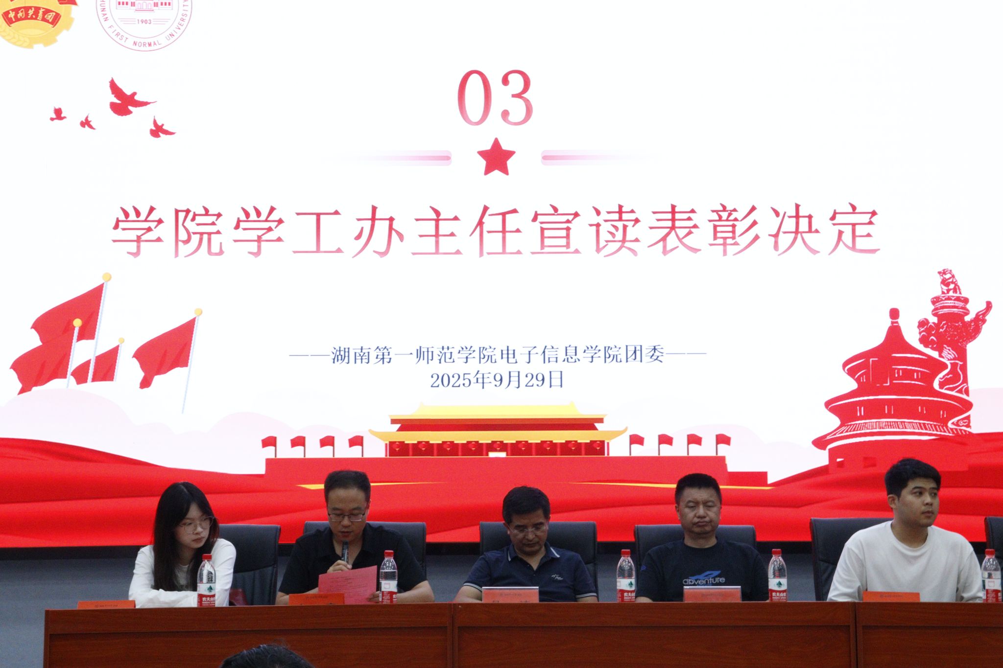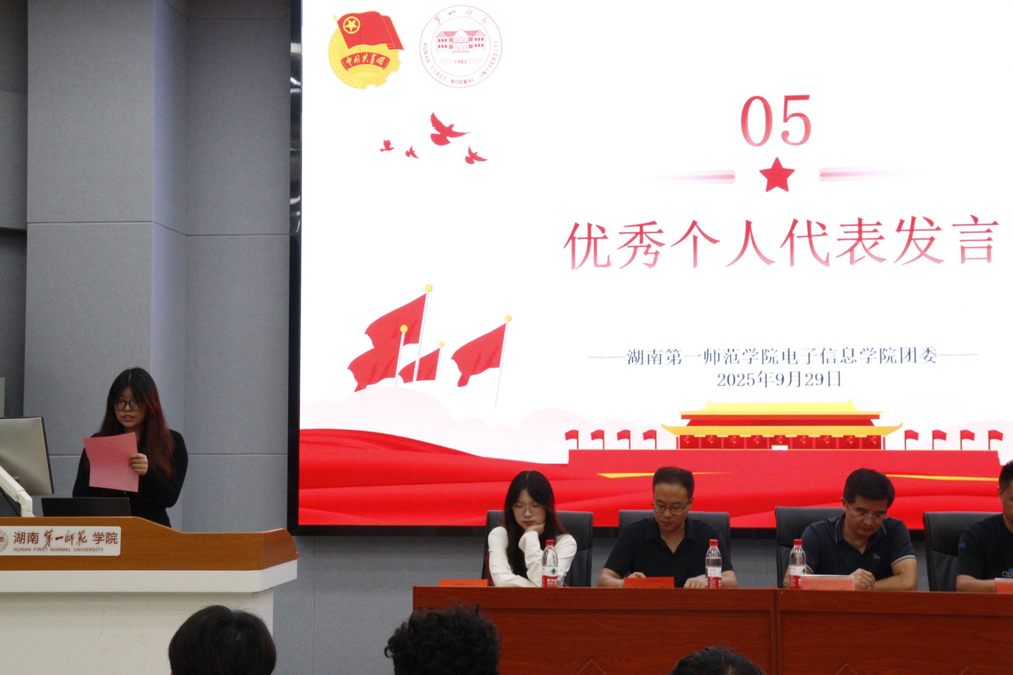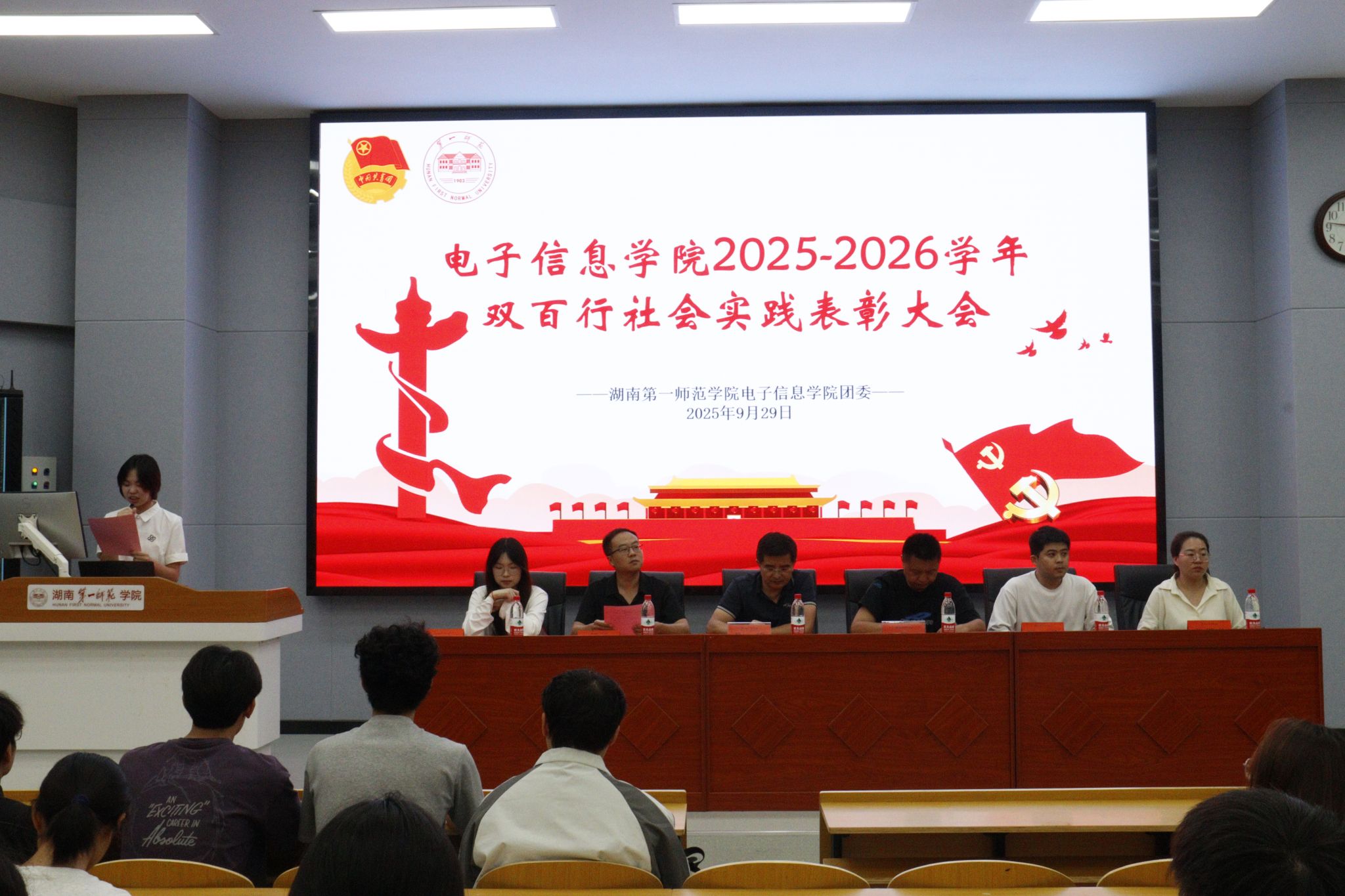 2025年9月29日,电子信息学院2025-2026学年双百行社会实践表彰大会在润寰南105隆重举行。参加本次大会的人员有院党委书记吴涛、院党委副书记伍雁鹏、学工办主任余亮、分团委书记谭炜、学生党支部书记姚瑶、辅导员宋殿梅、获奖团队及个人,以及百余名学生代表。
