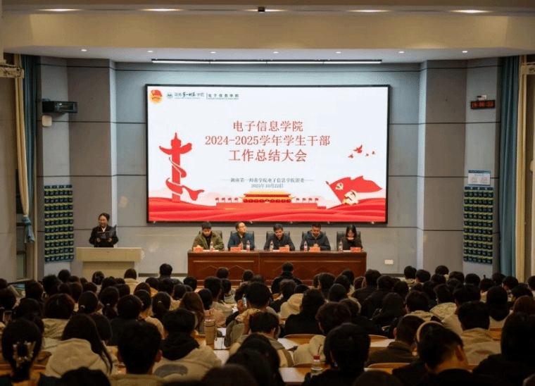为深入学习贯彻习近平总书记关于青年工作的重要思想,着力为党培养和输送青年政治骨干,10月22日19点,电子信息学院在怀中南110召开了2025-2026学年第四期青年马克思主义者培养工程(以下简称“青马工程”)开班仪式,并对上一阶段涌现出的优秀学生干部及工作人员进行表彰。院党委书记吴涛、院党委副书记伍雁鹏、学工办主任余亮、分团委书记谭炜、学生党支部书记姚瑶、院核心干部、24级学生干部代表及全体25级实习干事共同参会。